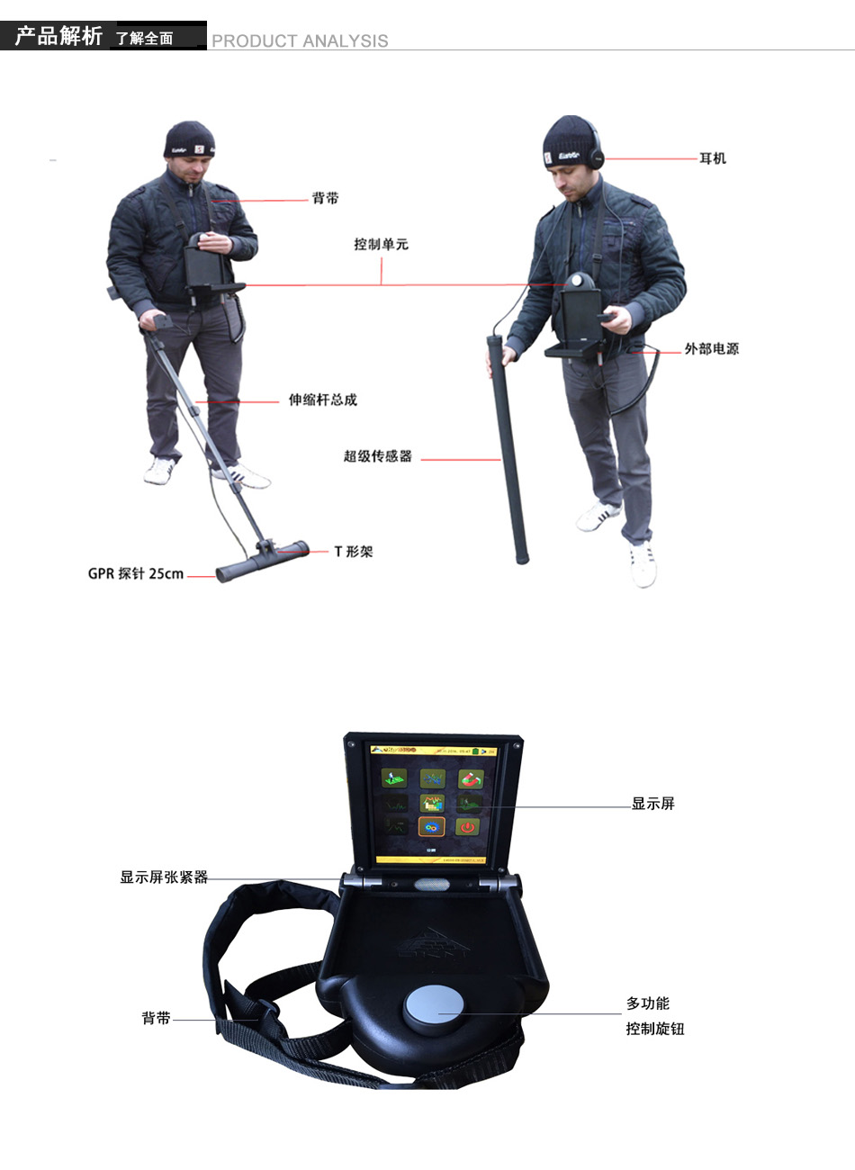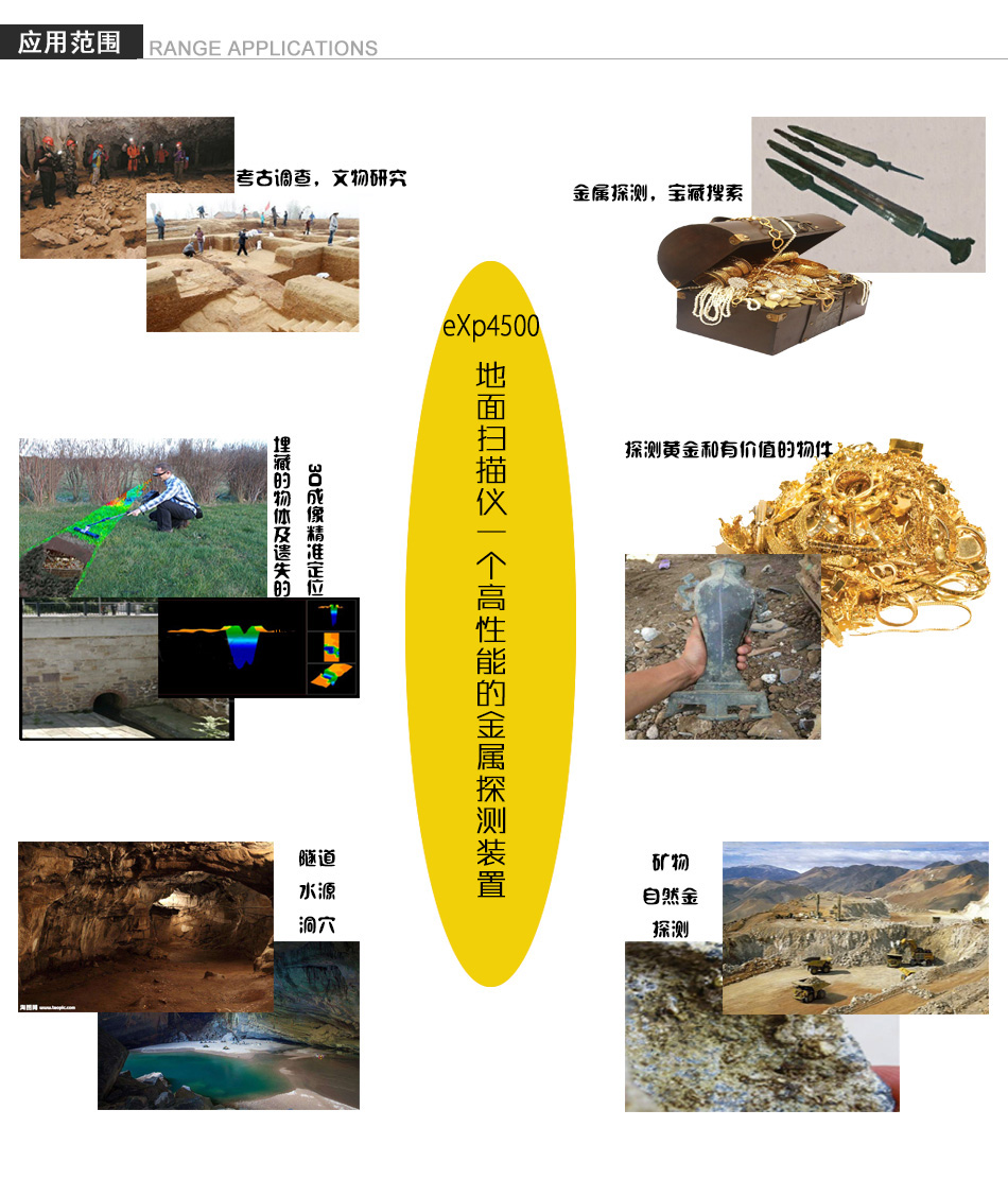 eXp-4500可視成像探測器基于EMSR技術(shù),不僅可以用于探測金屬物質(zhì), 還可以探測地層、山洞、孔洞、斷層、地下水層等其他非金屬物體。eXp-4500 可視成像探測器最適合用于探測地下墓穴、寶藏、埋藏物品和容器等等。eXp-4 500可以定位、記錄和分析不同結(jié)構(gòu)的埋在地下的物體,而不用任何挖掘。eXp- 4500非常輕便、靈活,并可以快速、便捷地提供可重復的結(jié)果。探測深度25米.
